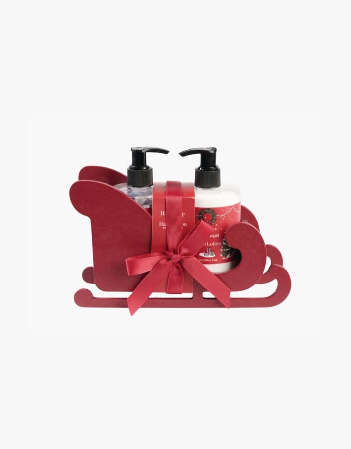 Sleigh gavesett 2x280ml: Gavesett bestående av håndsåpe og håndkrem med duft av furu, pakket sammen i en morsom treslede med sløydebånd.
